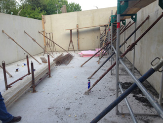 Die Aushubarbeiten für den Keller sind beendet und die Bodenplatte ist betoniert